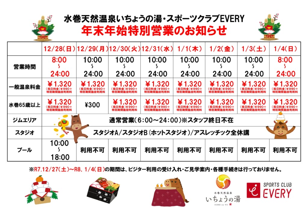 ◎12/27(土)~R8.1/4(日)の期間はビジターの受け入れ・各種お手続き・初回ご案内・ご見学案内は受け付けておりません。 ◎12/28(日)~R8.1/4(日)ジムスタッフ終日不在。 ◎12/28(日)~R8.1/4(日)全レッスン休講。 ◎(会員様)ジムエリアは通常通りa.m.6:00~24:00まで使用可能。 ◎プールは12/29(月)~R8.1/4(日)まで使用不可。 皆様のご来館を心よりお待ちいたしております。