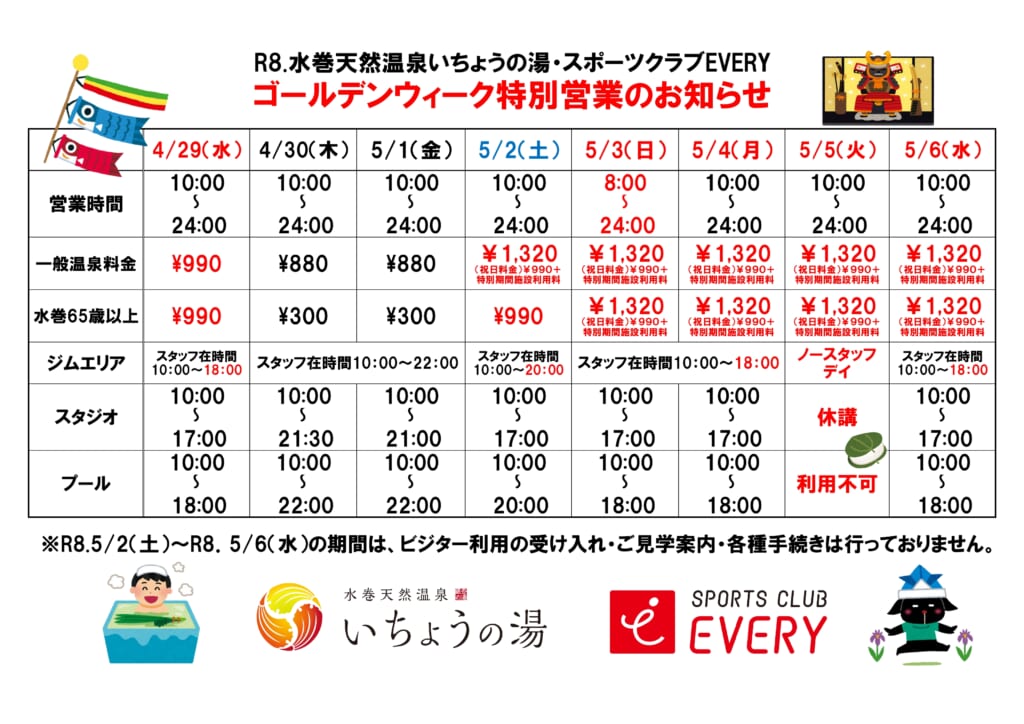 スポーツクラブEVERY&水巻天然温泉いちょうの湯 4周年記念祭のお知らせ